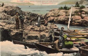This image depicts, ‘Bankers’, or fisherman of the Grand Banks, sourcing fresh water at Cape Broyle, Newfoundland, circa early 20th century