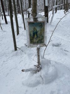 When we headed out along the Shrine trail, I noticed that an 8.5 x 11 placard nailed to a tree above a cross made of two white birch sticks once again announced a shrine to St. Kateri.